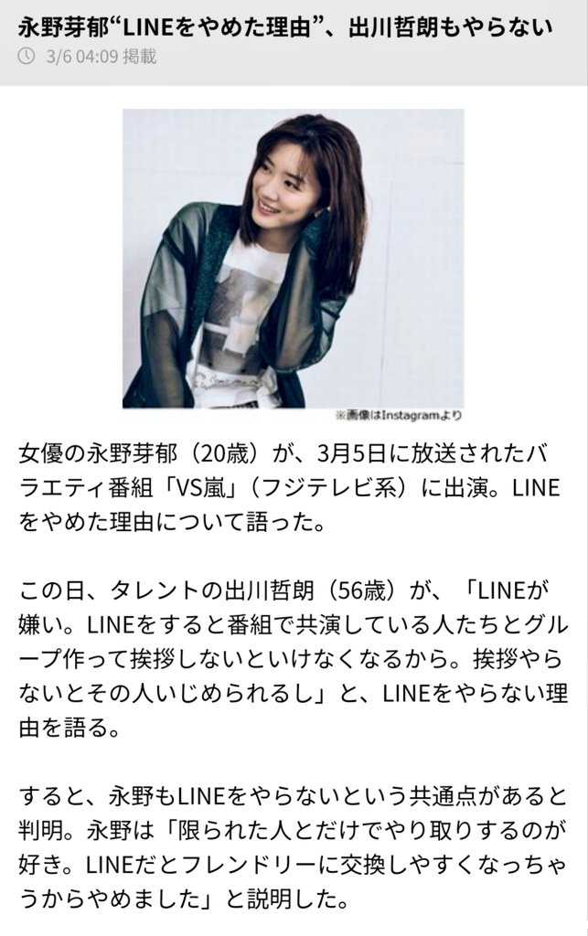 【朗報】永野芽郁(25)、一発大逆転か?そもそもLINEをやっていなかった模様