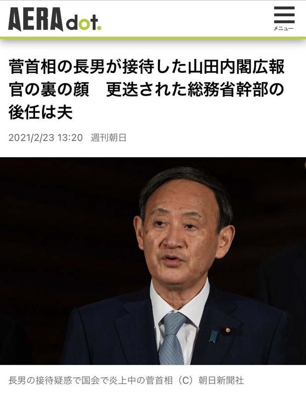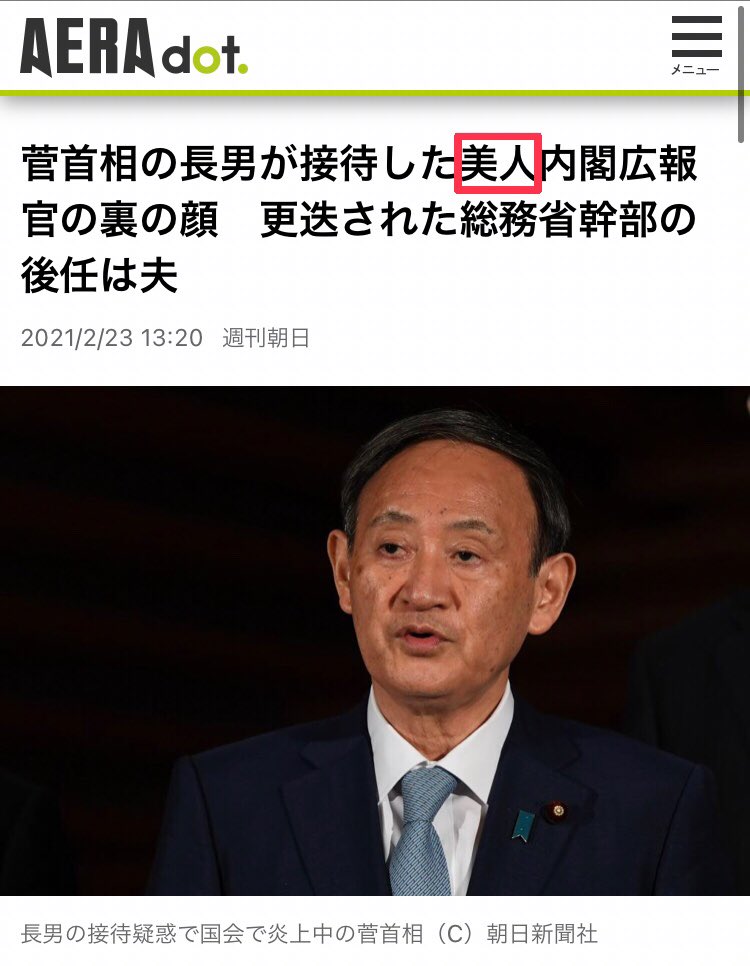 【朝日】 AERA dotさん 菅首相息子の接待記事で「美人」広報官の「美人」をこっそり削除