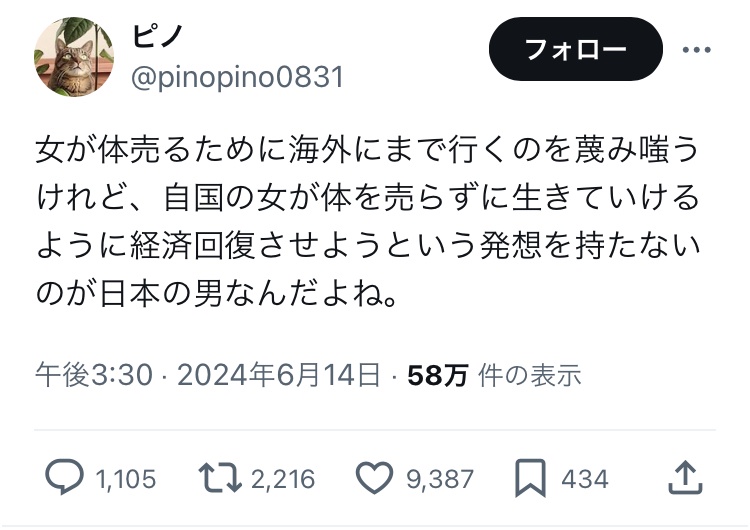 女が体売るために海外にまで行くのを蔑み嗤うけれど、自国の女が体を売らずに生きていけるように経済回復させようという発想を持たないのが日本の男なんだよね。— ピノ (@pinopino0831) June 14, 20246 : 以下、?ちゃんねるからVIPがお送りします :2024/06/15(土) 10:48:28.663 ID:WYklwhFa0.net>>3>>3マジで言ってて草4 : 以下、?ちゃんねるからVIPがお送りします :2024/06/15(土) 10:47:18.442 ID:QoPijv6q0.netその発想はなかった転載元スレッド:https://viper.2ch.sc/test/read.cgi/news4vip/1718415976/続きを読む