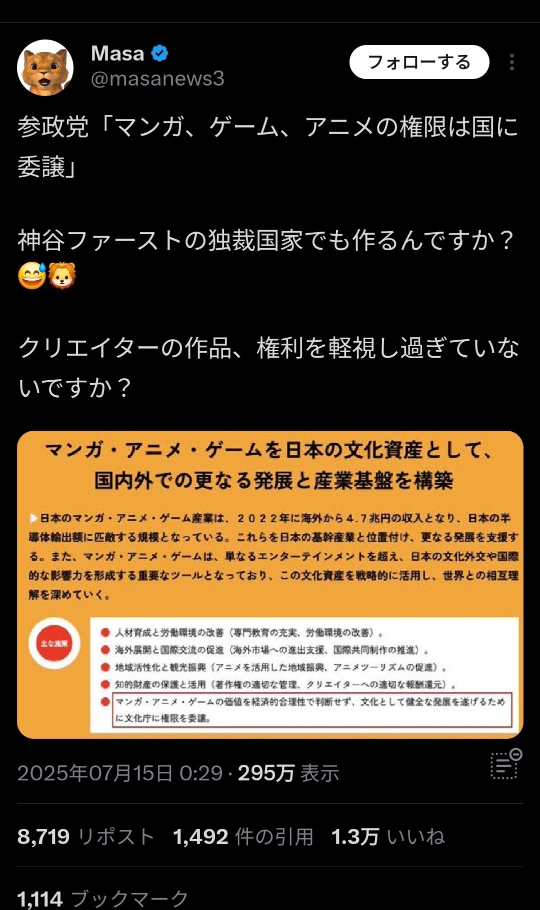 【炎上】参政党「マンガ、アニメ、ゲームの権限は国に委譲します」wwwwwwwww