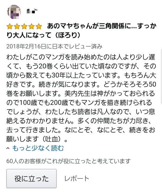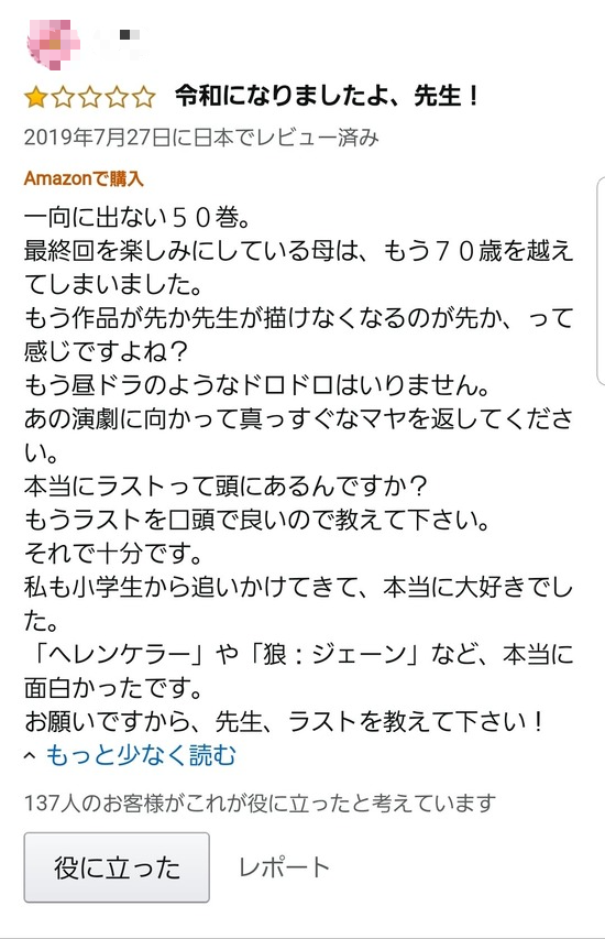 【画像】『ガラスの仮面』最新刊(2014年発売)のAmazonレビュー、切実www