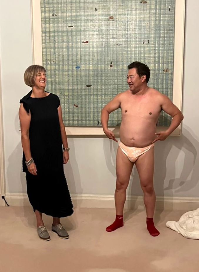 大使の面前で「全裸に見えるネタ」と「Don’ t worry, I’m wearing…」の決めポーズを披露している写真を投稿。大使も満面の笑顔で応えています。