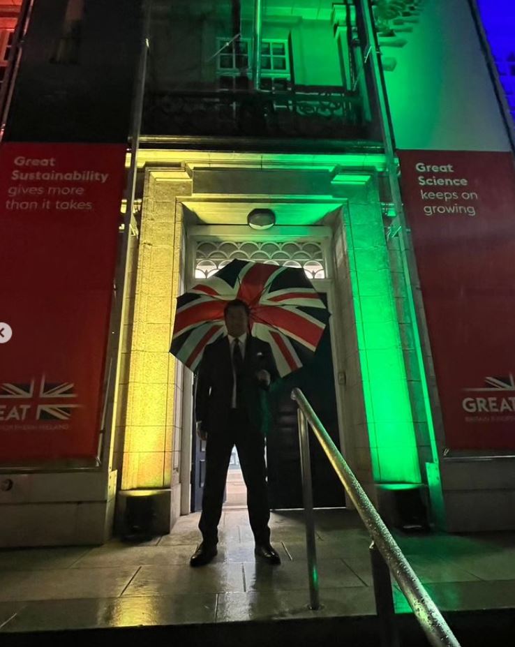 一連の写真の最後は、ユニオンジャック柄の傘をさし、スーツ姿で英国大使館の前に立つスマートな姿。