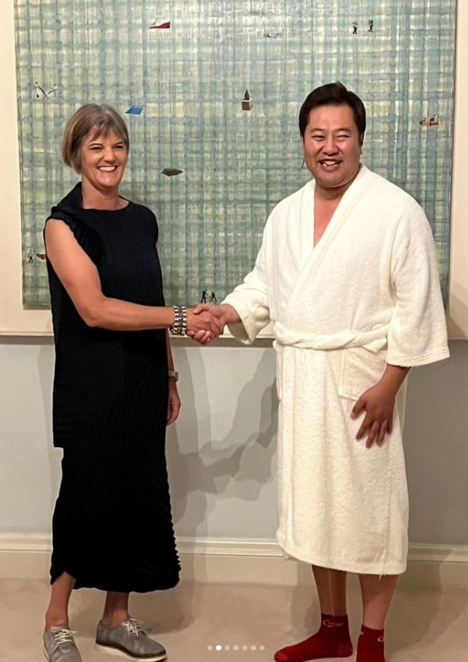 続いて、ガウン姿でジュリア・ロングボトム駐日英国大使と握手する写真を投稿。