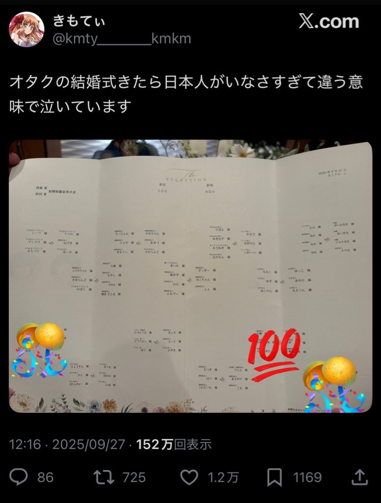 2 : 以下、?ちゃんねるからVIPがお送りします :2025/09/28(日) 14:55:11.953 ID:I+aSbWxk0.netせっかくキモい結婚式に金払って来てあげたのにこの始末3 : 以下、?ちゃんねるからVIPがお送りします :2025/09/28(日) 14:55:48.118 ID:I+aSbWxk0.net友人だけの結婚式なら別にいいやろって思ったら普通に親族いるやん転載元スレッド:https://viper.2ch.sc/test/read.cgi/news4vip/1759038866/続きを読む