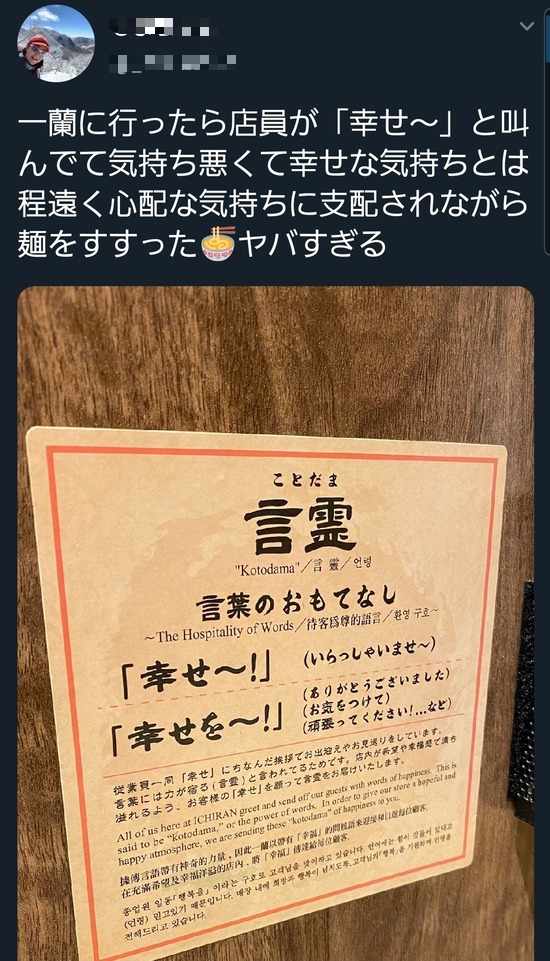 【画像】ラーメン一蘭、「いらっしゃいませ」の代わりに「幸せ~!」と叫んでいる模様wwwww