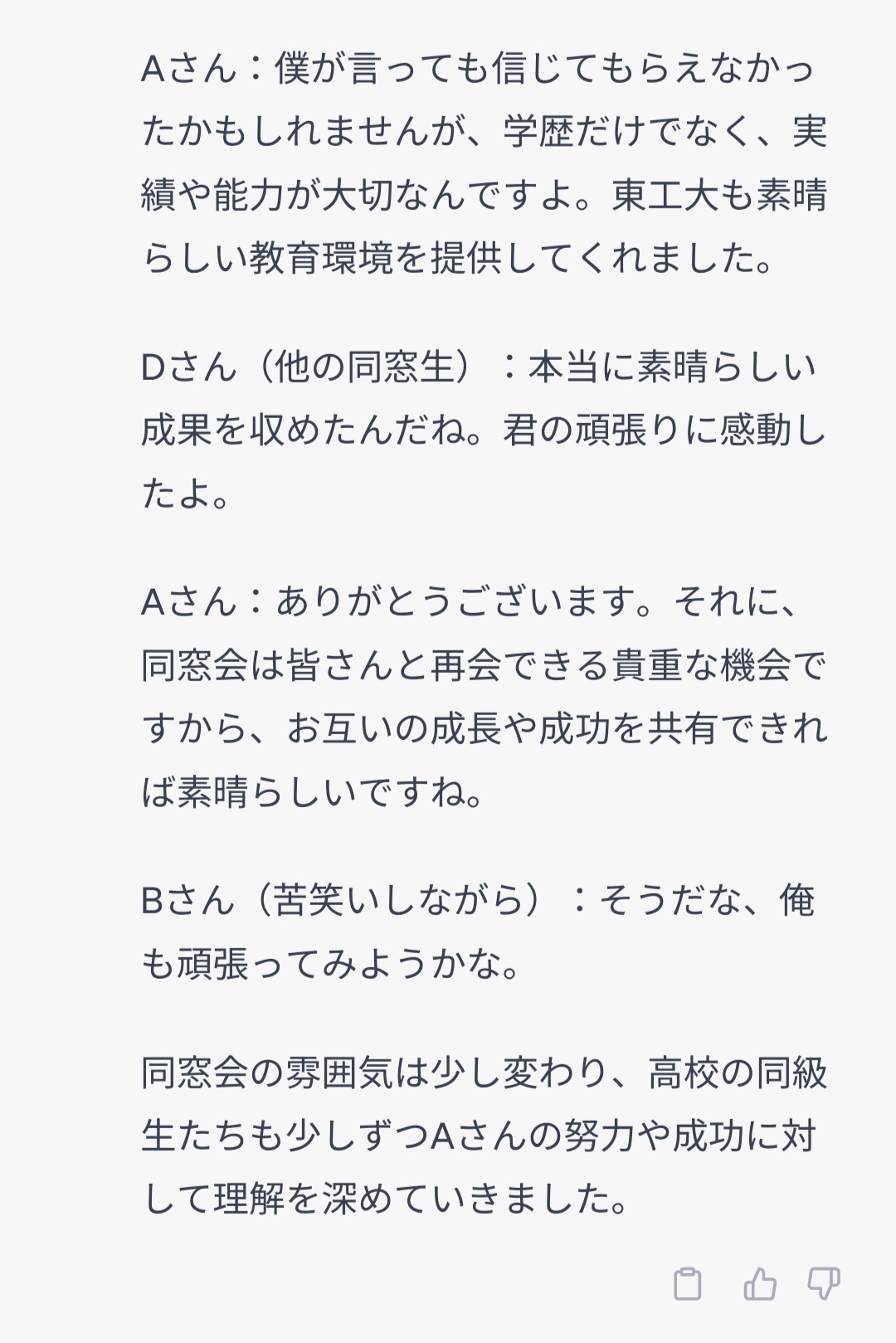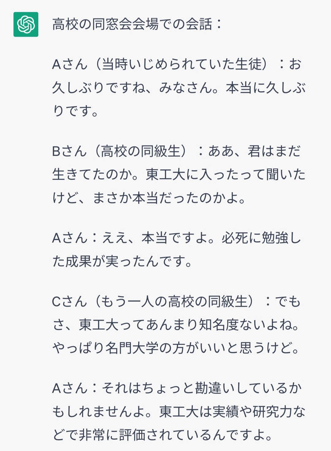 【画像】ワイ「いじめられっ子が同窓会で立場逆転するストーリー作って」ChatGPT「了解しました」