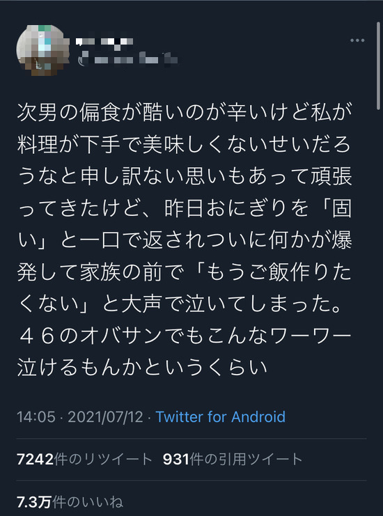 【画像】主婦「家族に飯まずと言われてわんわん泣いちゃった」七万いいね!