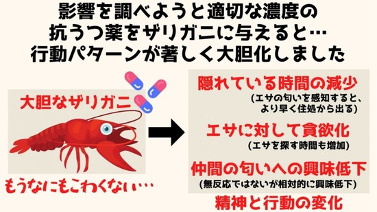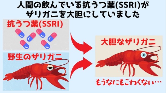 人間が飲んだ抗鬱剤が糞尿に紛れて川に流れる → ザリガニがそれを飲む → 恐れ知らずのザリガニ爆誕!!