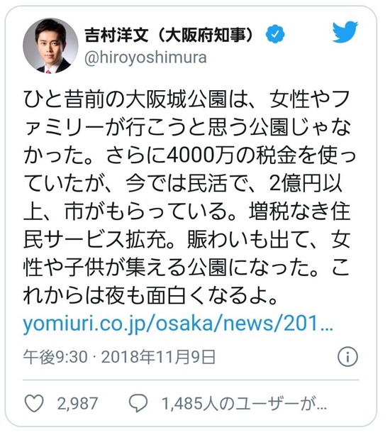 【画像】吉村知事「大阪城公園は女子供を近寄せないスラム街だったが今では年二億円市に納めてる」
