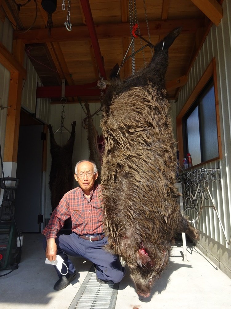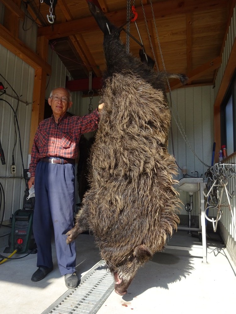 1: 以下、ニュー速クオリティでお送りします 2022/11/11(金) 09:05:55.75 ID:c4BX9LB50 体重200キロ超、体長182センチ、胴回り141センチもある雄の巨大イノシシが、鳥取県江府町内の山中で仕留められた。地元でジビエ解体処理施設を運営する「奥大山地美恵(じびえ)」が仕掛けたワナに掛かった。ぼたん鍋で200~300人分の肉が取れる超大型獣で、関係者は「国内最大級の山の主かも」と驚愕(きょうがく)した。