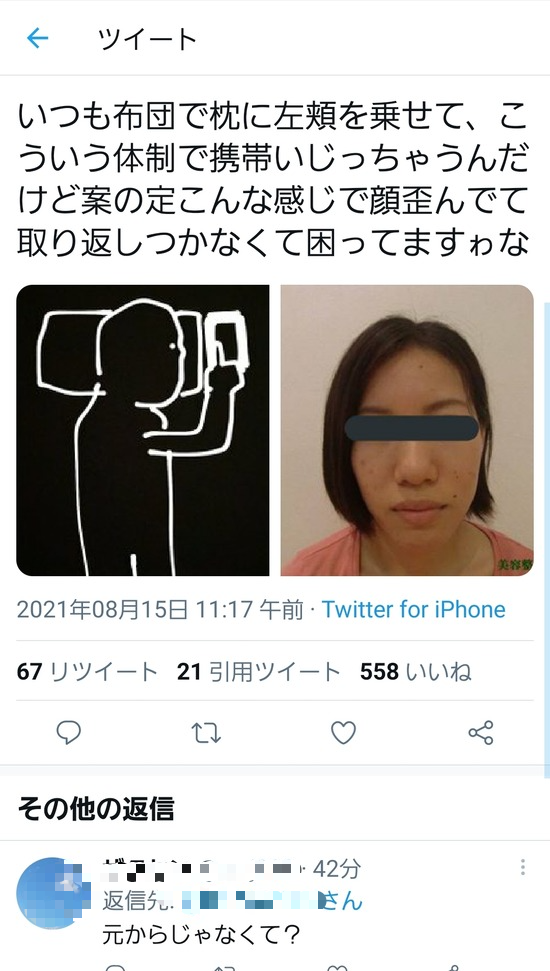 【画像】女「こういう姿勢でスマホいじりまくってたら顔歪んで草」