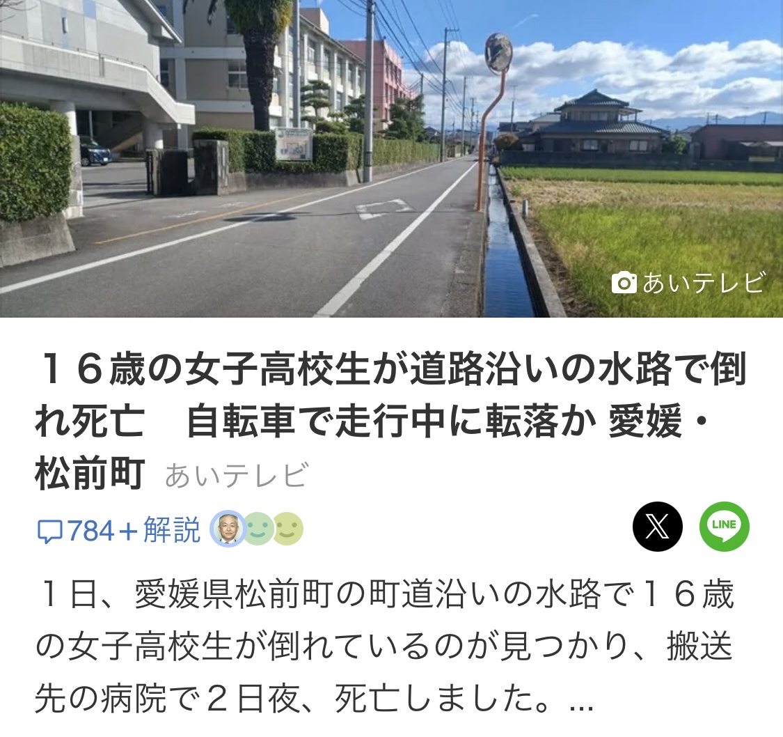 1 : 以下、?ちゃんねるからVIPがお送りします :2025/11/03(月) 22:49:11.273 ID:87ovI0ZK0.net16歳の女子高校生が道路沿いの水路で倒れ死亡 自転車で走行中に転落か 愛媛・松前町(あいテレビ) - Yahoo!ニュースhttps://news.yahoo.co.jp/articles/508232bdc0ad16cd4ed21d1c9fa4cf2e2021325d転載元スレッド:https://viper.2ch.sc/test/read.cgi/news4vip/1762177751/