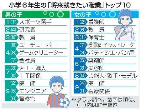 男の子の4位にユーチューバー(昨年16位)、女の子の8位に芸能人・歌手・モデル(同14位)が入り、新型コロナウイルス流行により自宅で過ごす時間が長くなった生活様式の変化を映した可能性がある。