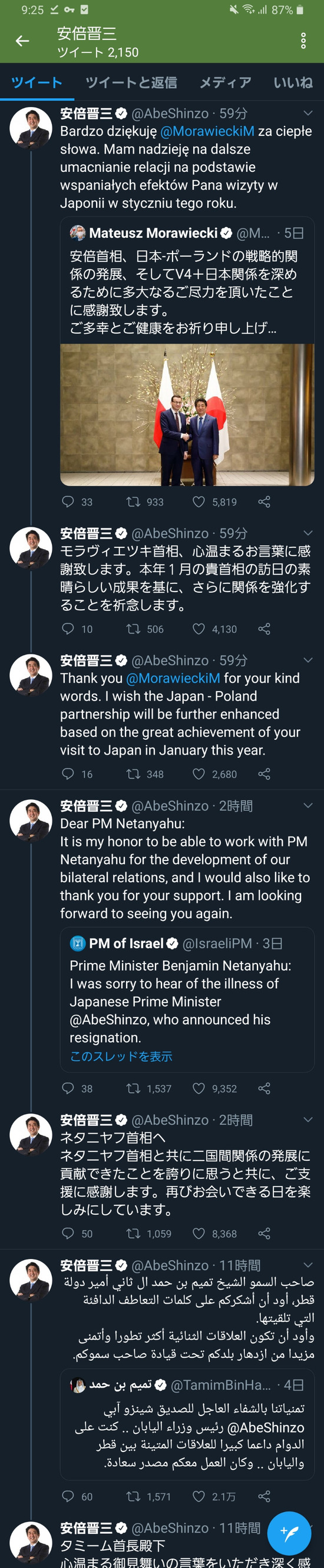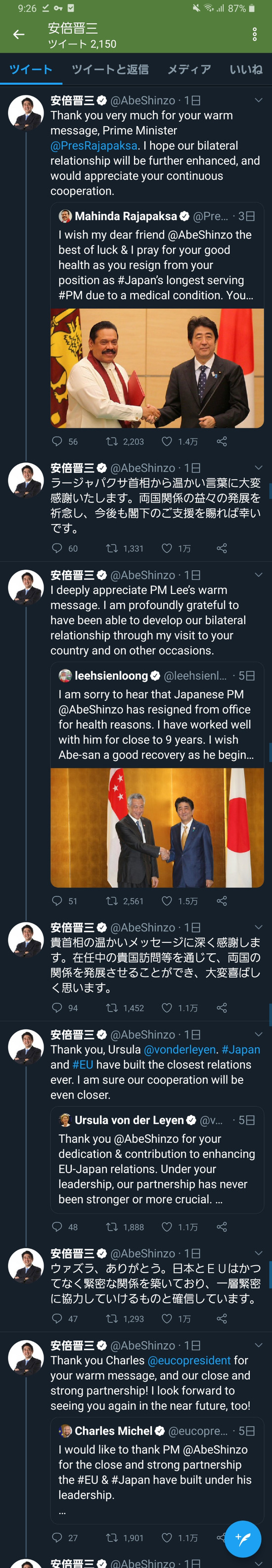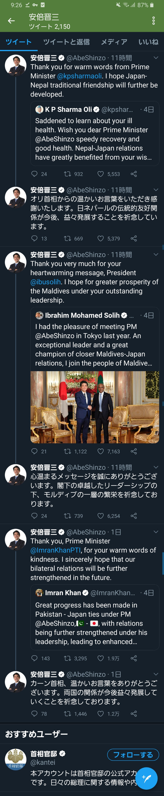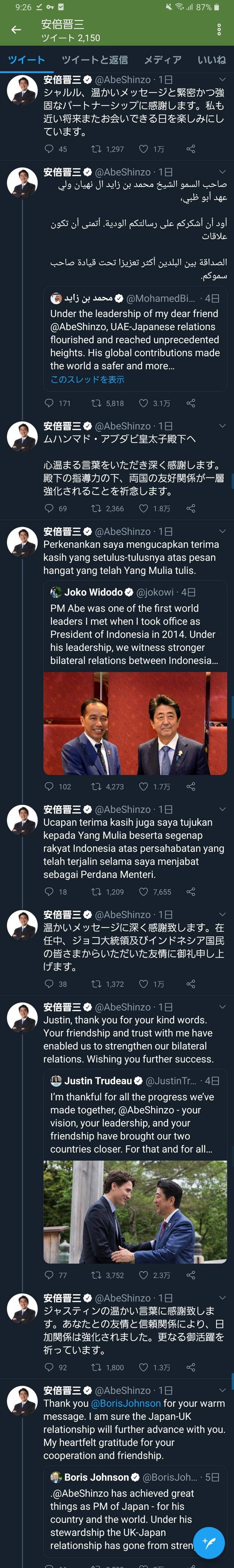 【画像】安倍晋三さんへ世界各国の首脳から労いツイートの嵐wwwww