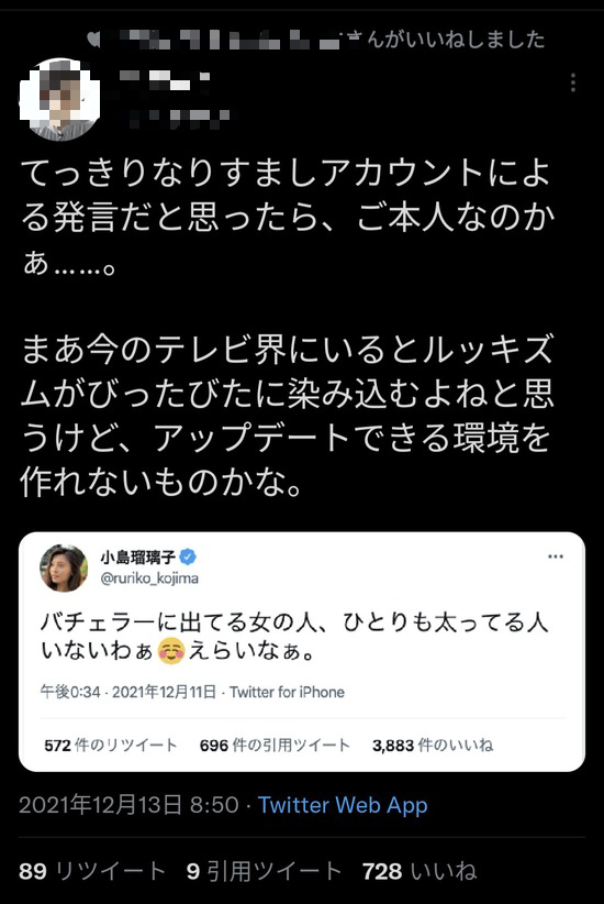 【画像】小島瑠璃子「バチェラー出てる人みんなスリムで素敵」 フェミニスト「意識アップデートしろ!!!」