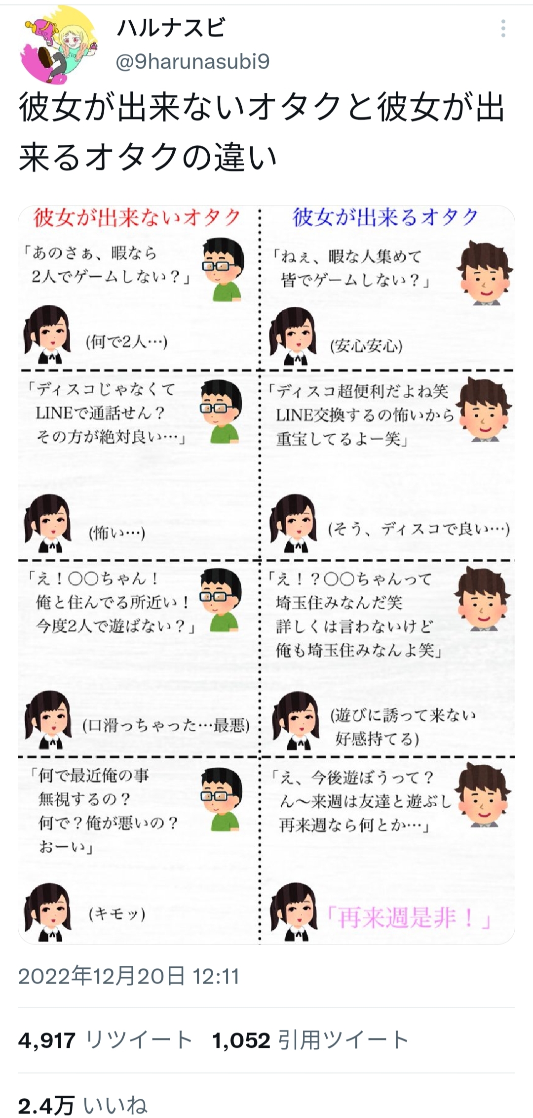 【画像】彼女ができるオタクとできないオタクの違いがコチラ 2.4万いいねwww