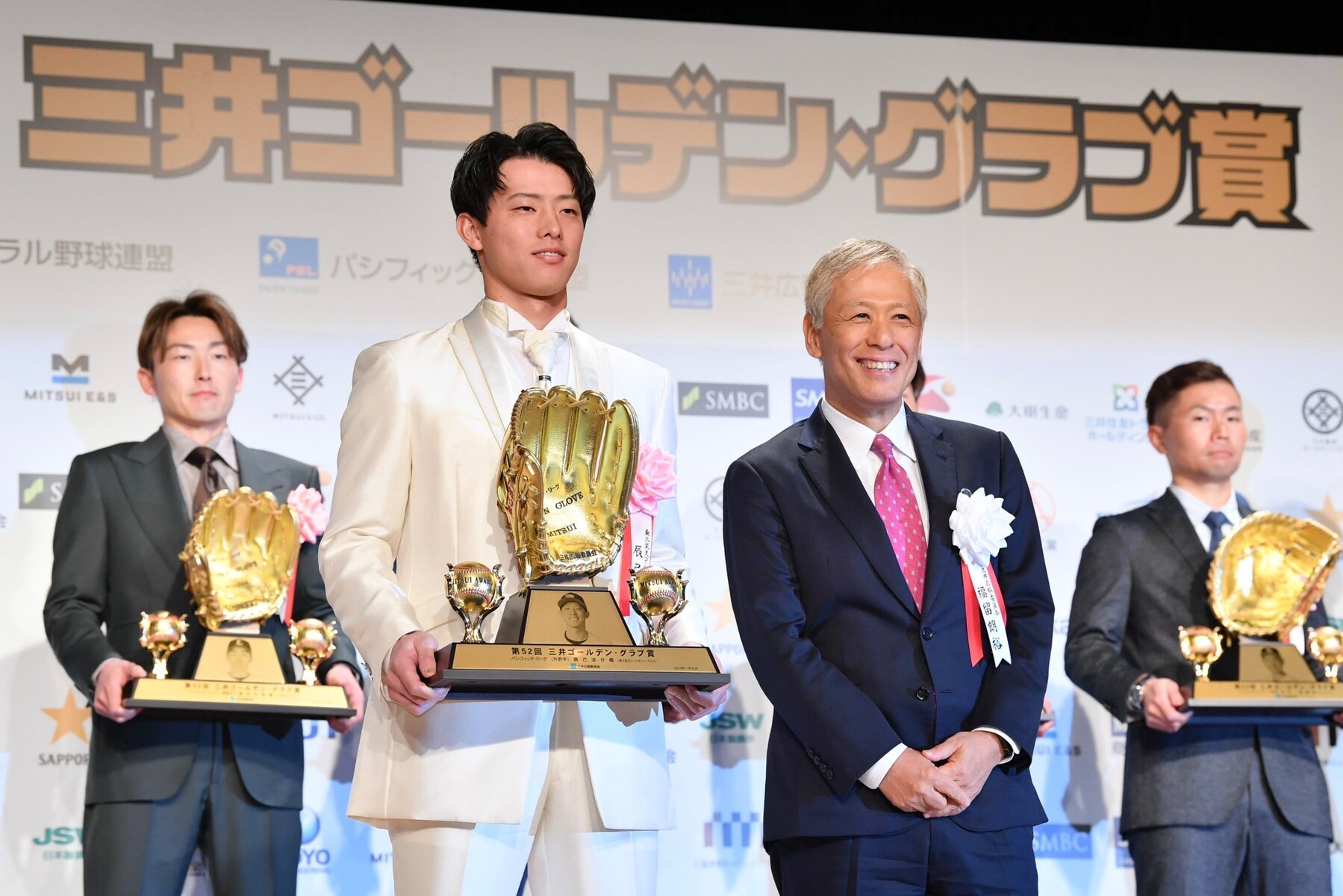 【画像】楽天辰己涼介さん、GG賞表彰式にてド派手な上下純白のキラキラスーツで登場し、会場を沸かせるwww