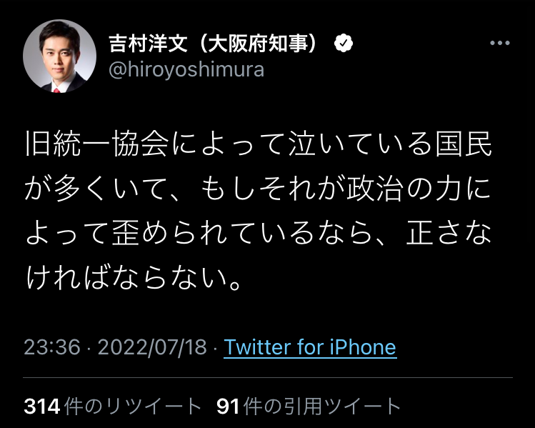 【画像】維新の吉村知事、統一教会と戦う意志を表明www
