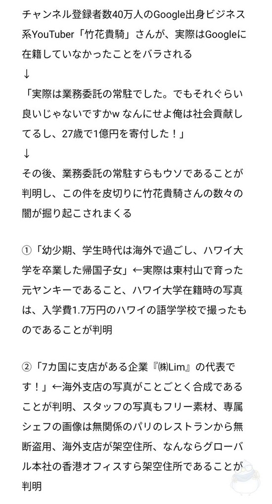本当なら凄い経歴なのにマルチまがいのビジネススクールを運営していることで以前より界隈から訝しまれていたが、とうとうバレてしまう。