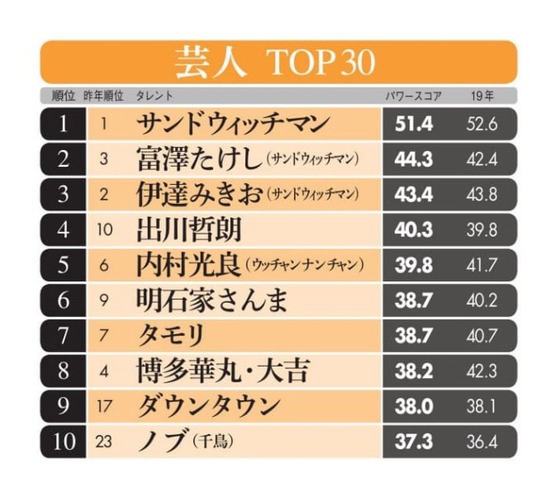 【画像】芸人パワーランキング2020が発表されるwwwwwwwwwwww