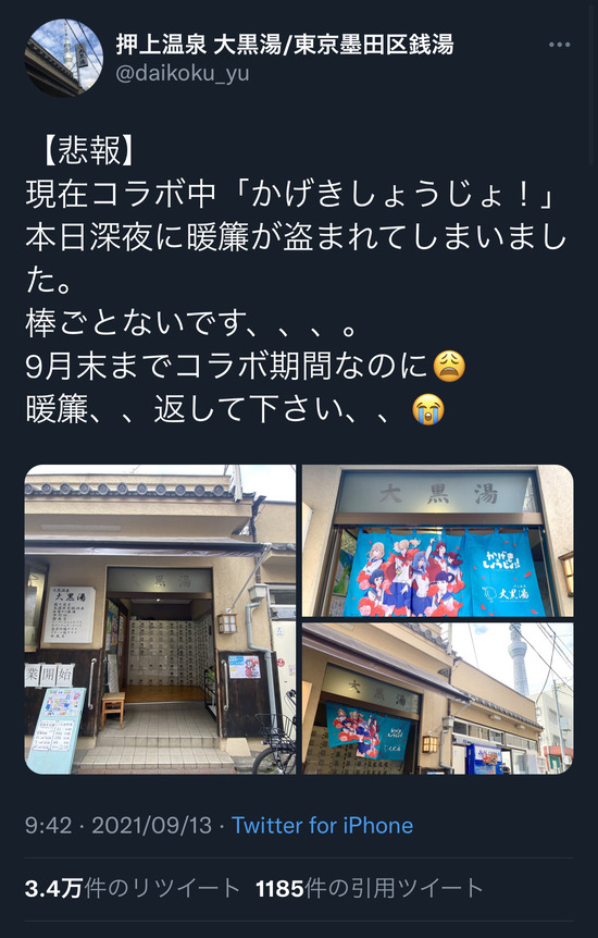 【画像】街の優しい銭湯屋さん、アニメとコラボした結果暖簾を盗まれてしまうwwwww