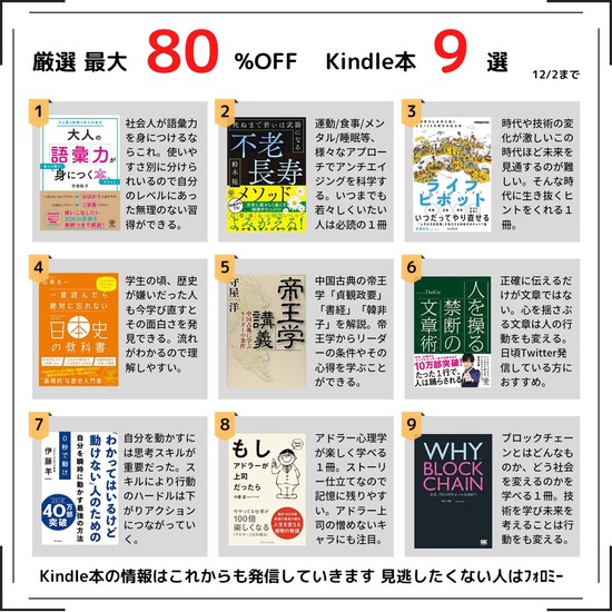 驚きました。AmazonがKindle本 最大80%OFFのブラックフライデーをやってます。「でも何を選んでいいかわからない...」そんな声が聞こえてきそうなので、私が3万冊以上の中から9冊厳選しておきました。
