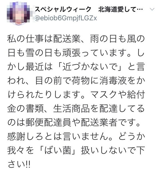 【画像】配送業さん、心ない人々に消毒液をかけられる「私たちをバイ菌扱いしないで」