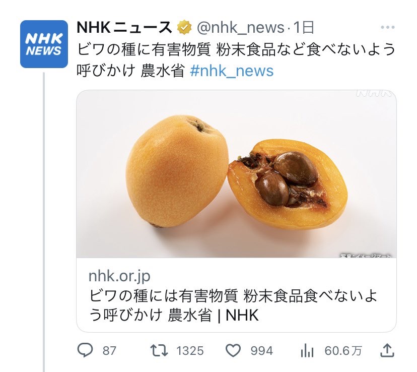 農林水産省が以前から「ビワの種にはシアン化合物が含まれているから大量摂取は危険」と警告していることをNHKが紹介