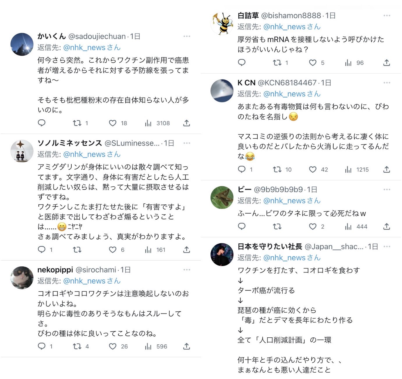 「ビワでがんが治ると薬が売れなくなるから隠してるんだろ❗」と主張する陰謀論者がリプ欄に殺到する