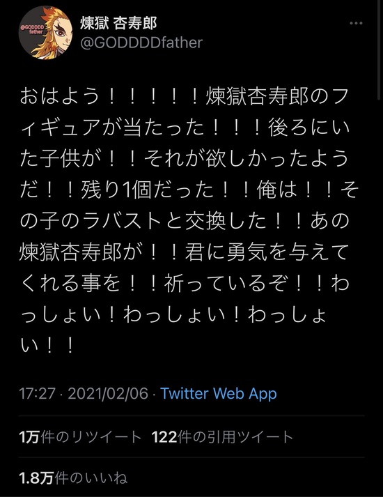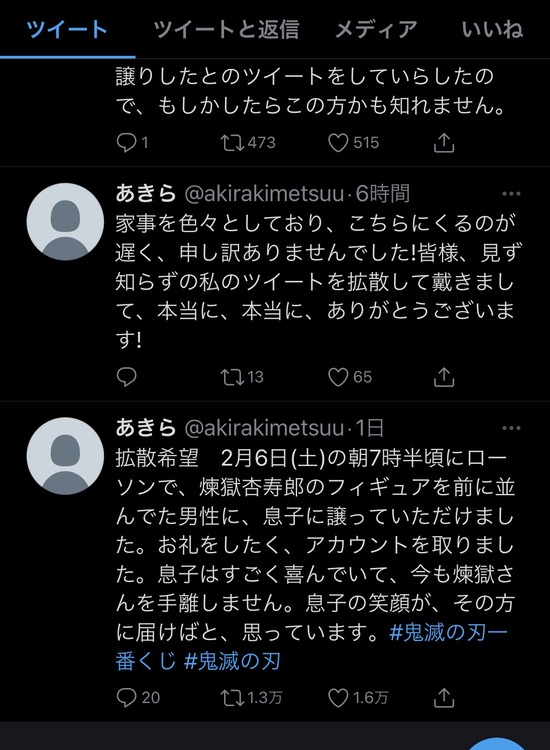【画像】鬼滅のフィギュアを譲った男と譲られた母親がTwitterで感激の再会に・・・・