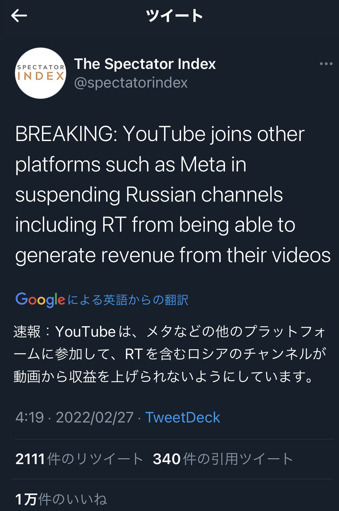 速報:YouTubeは、メタなどの他のプラットフォームに参加して、RTを含むロシアのチャンネルが動画から収益を上げられないようにしています。