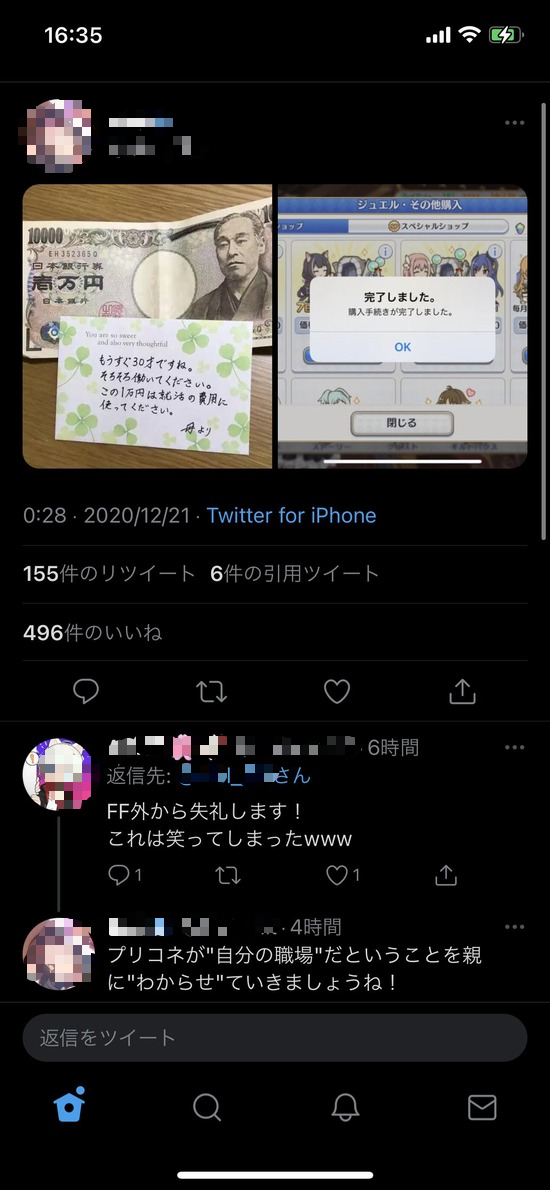 【画像】J( 'ー`)し「そろそろ働いてください。この1万円は就活の費用に使ってください」 →即課金www