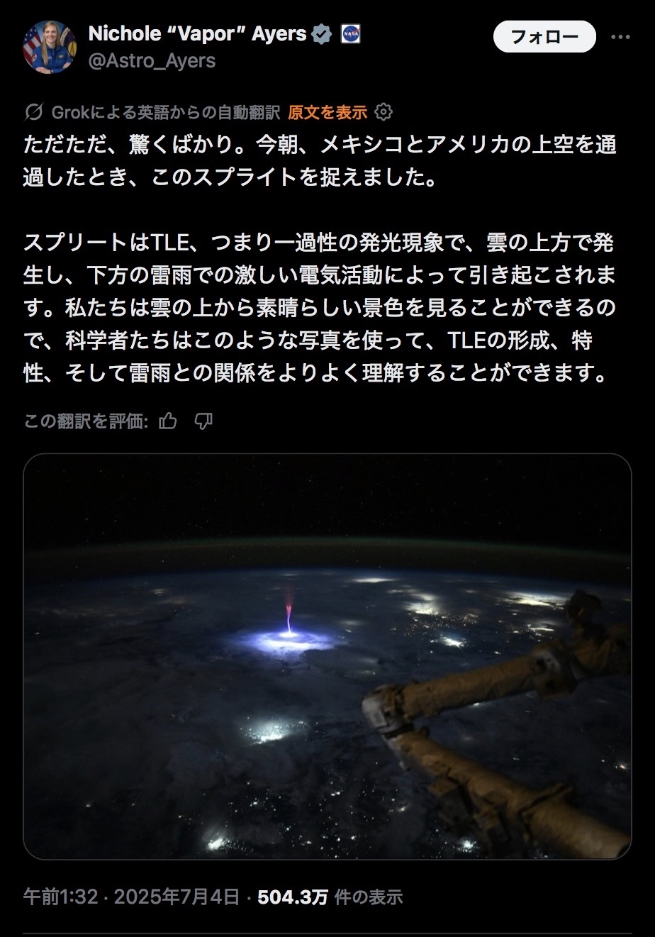 なんか召喚した?Just. Wow. As we went over Mexico and the U.S. this morning, I caught this sprite.Sprites are TLEs or Transient Luminous Events, that happen above the clouds and are triggered by intense electrical activity in the thunderstorms below. We have a great view above the clouds, so… pic.twitter.com/dCqIrn3vrA— Nichole “Vapor” Ayers (@Astro_Ayers) July 3, 2025転載元スレッド:https://viper.2ch.sc/test/read.cgi/news4vip/1757809519/続きを読む
