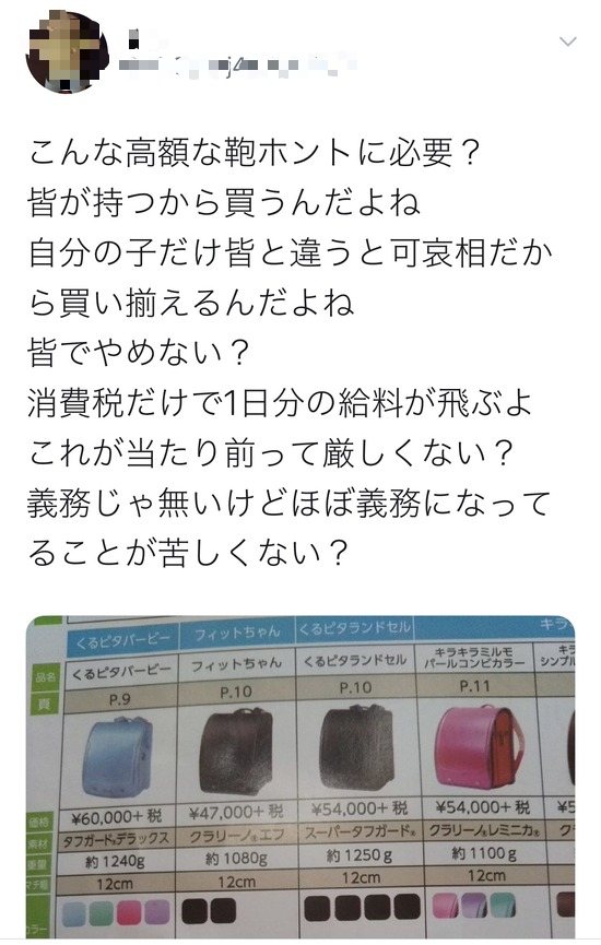 【画像】Twitter女さん「ランドセル高すぎる。皆が買うから買うんだよね?皆でやめない?」