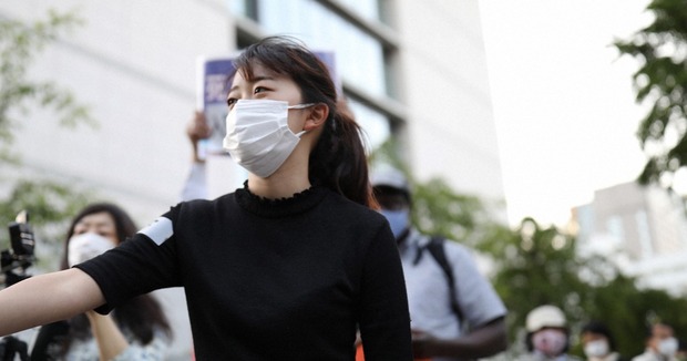 入管法改正案反対の抗議活動を取り仕切る宮島ヨハナさん=東京都千代田区で2021年4月30日午後5時58分、小出洋平撮影