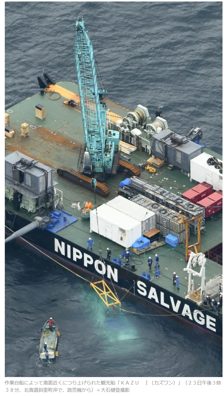 北海道・知床半島沖で観光船「KAZU I(カズワン)」(乗客乗員26人)が沈没した事故で、第1管区海上保安本部は24日、カズワンを海中につった状態で移動させていた専門業者の作業台船からカズワンが水深182メートルの海底に落下したことを明らかにした。1管によると、24日午前8~10時頃、ウトロ漁港(北海道斜里町)の西約11キロの海域で落下したとみられる。同日午前10時20分に「カズワンを落とした」と1管に連絡が入った。水中カメラを搭載した無人潜水機で確認したところ、船底を下にした状態で沈んでいて、原形をとどめ、大きな損傷は見当たらないという。 作業台船「海進」を運航しているのは、海上保安庁と契約した「日本サルヴェージ」。23日に水深約115メートルの沈没地点からカズワンをワイヤでつり上げ、深さ約20メートルの海中にカズワンをつったまま、水深の浅い斜里町沖約7キロの海域に向かっていた。同海域で、いかりを下ろして海進の船上にカズワンを引き揚げる予定だった。 落下したカズワンは、深海に潜る特殊技術「飽和潜水」で再びつり上げられる見通しだ。飽和潜水では、潜水士は作業台船の加圧室で深海の水圧に体を適応させた後、水中エレベーターで海底に下りて作業する。 一方、1管などは24日も北方領土・国後島周辺を含めた海域で行方不明者12人の捜索を続けているが、有力な手がかりは見つかっていない。https://www.google.com/amp/s/www.yomiuri.co.jp/national/20220524-OYT1T50136/amp/
