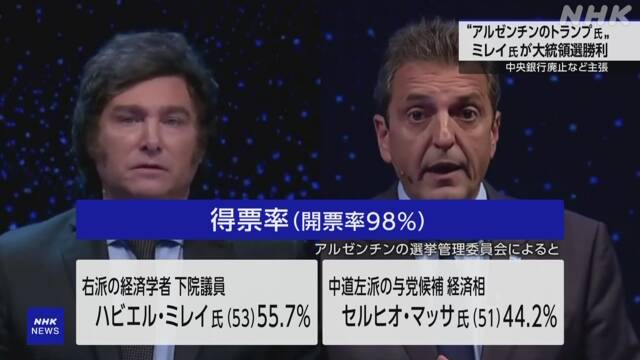でミレイ氏が勝利しました。https://www3.nhk.or.jp/news/html/20231120/K10014263241_2311201052_1120111204_01_05.jpg