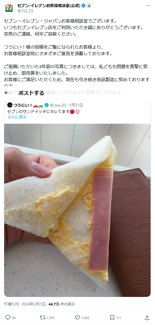 1 名前:名無しさん@おーぷん[] 投稿日:24/02/02(金) 18:20:23 ID:50B4セブンーイレブン・ジャパンお客様相談室でございます。いつもセブンイレブン店をご利用いただき誠にありがとうございます。突然のご連絡、何卒ご容赦ください。つうにい!様の投稿をご覧になられたお客様より、お客様相談室宛にさまざまご意見を頂戴しております。… https://t.co/qN0g3ZNNqJ— セブン-イレブンお客様相談室(公式) (@711_CS) February 1, 2024