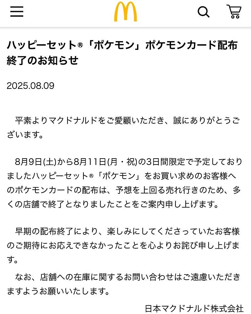 転売対策も個数制限もしていたにも関わらず秒速で終了(ちいかわを大幅に上回りハッピーセット最速記録)