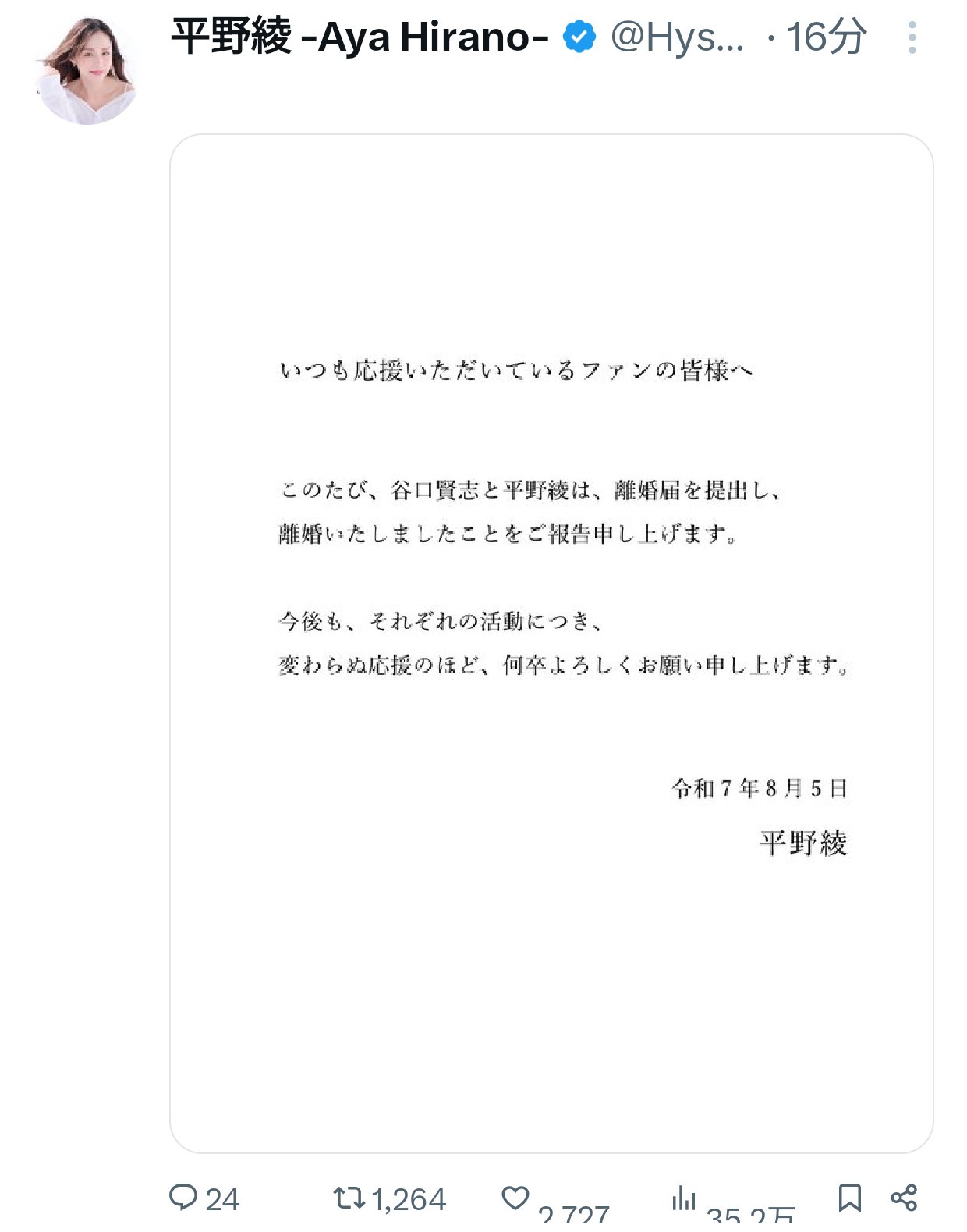 声優の平野綾と俳優の谷口賢志が離婚を報告「離婚届を提出し、離婚いたしました」(東スポWEB) - Yahoo!ニュースhttps://news.yahoo.co.jp/articles/8604ab368f4a2485062ddbe0e77249aceb0b037c転載元スレッド:https://viper.2ch.sc/test/read.cgi/news4vip/1754385473/