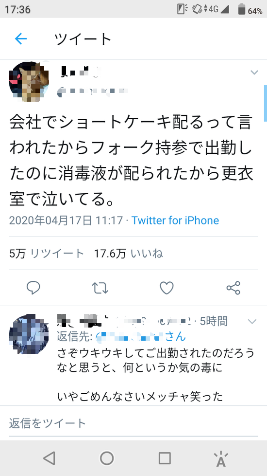 【エッ?】「会社でショートケーキ配ると言われたからフォーク持参で出勤。消毒液を配られて泣いてる」