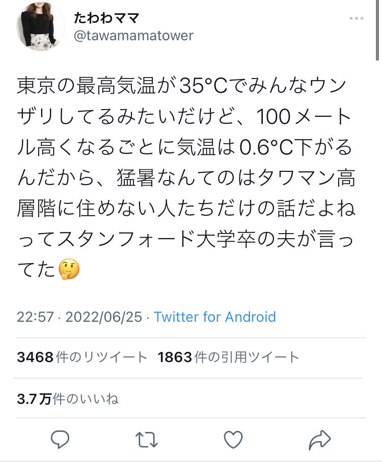 まんさん「100M高くなるごとに0.6℃気温下がるんだから、暑いのはタワマンに住めない人たちだけだよね」