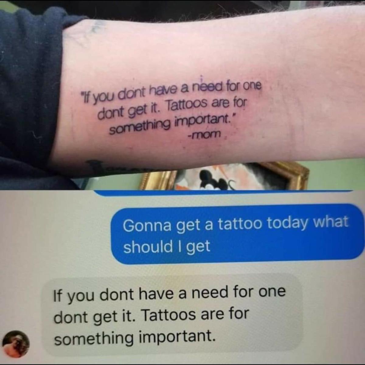 「入れなきゃいけないものがないならやめときなさい。タトゥーってのは何か大事なものを入れるものよ。 ~ママ~」