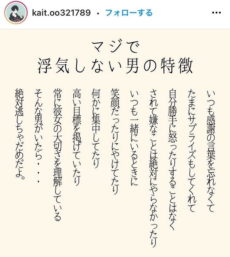 【画像】インスタ「マジで浮気しない男の特徴がこちら」