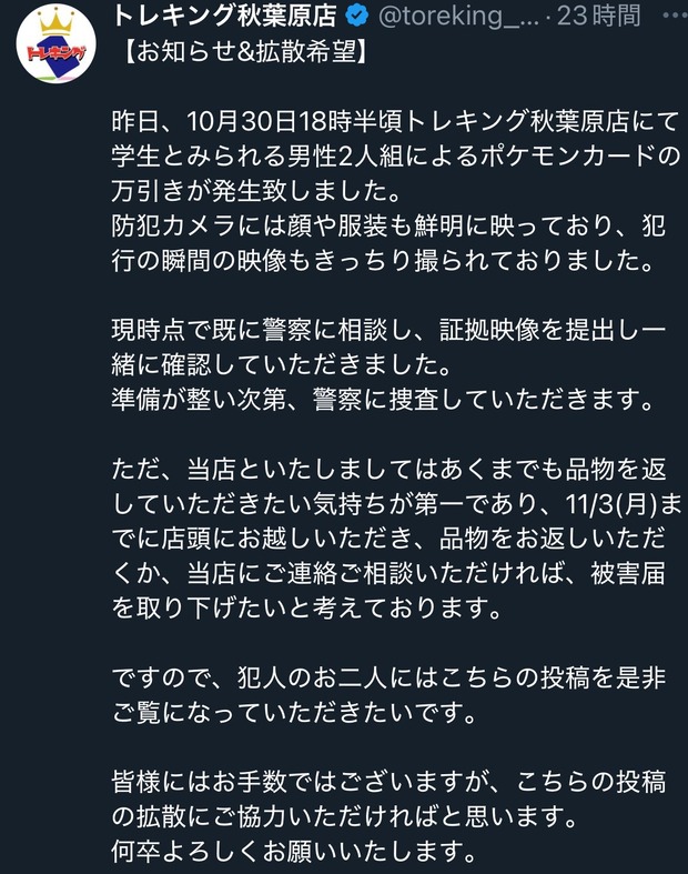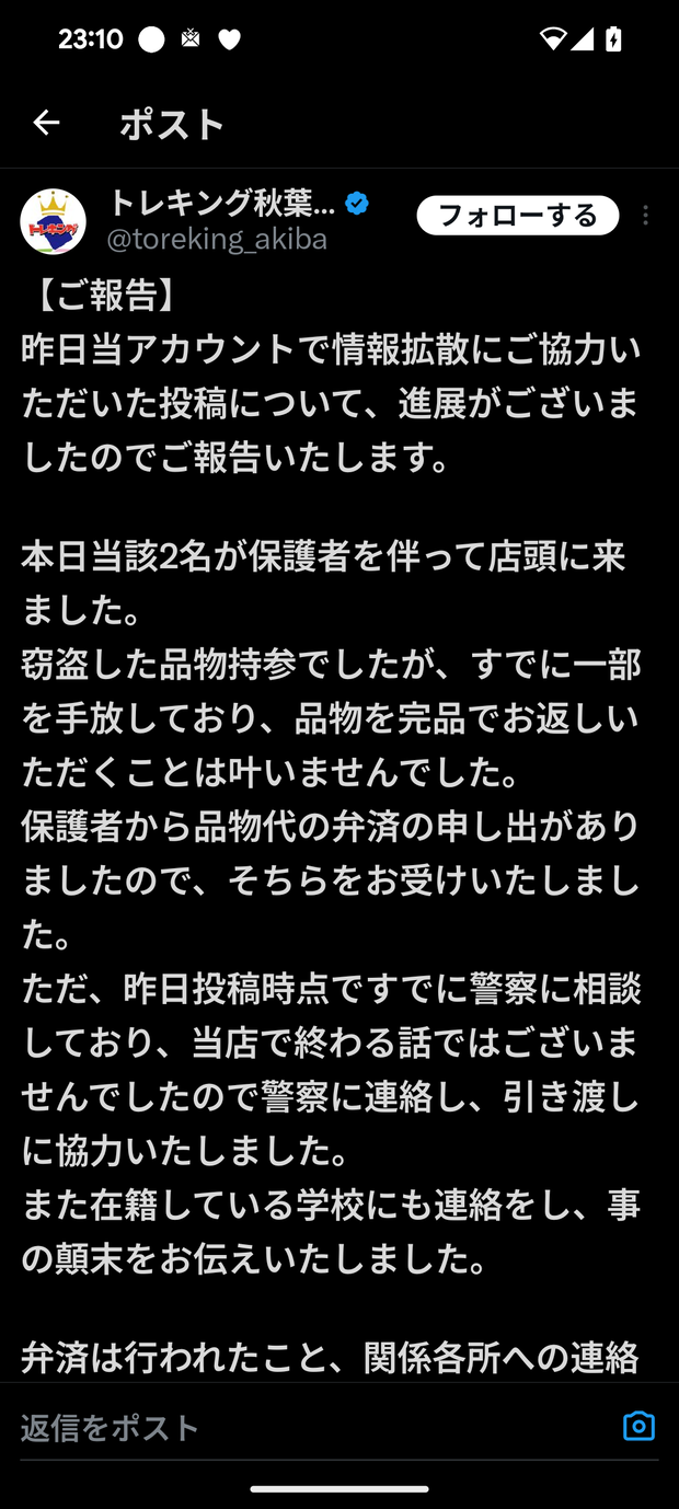 【ご報告】昨日当アカウントで情報拡散にご協力いただいた投稿について、進展がございましたのでご報告いたします。本日当該2名が保護者を伴って店頭に来ました。窃盗した品物持参でしたが、すでに一部を手放しており、品物を完品でお返しいただくことは叶いませんでした。…— トレキング秋葉原店 (@toreking_akiba) November 1, 2025転載元スレッド:https://viper.2ch.sc/test/read.cgi/news4vip/1762647626/