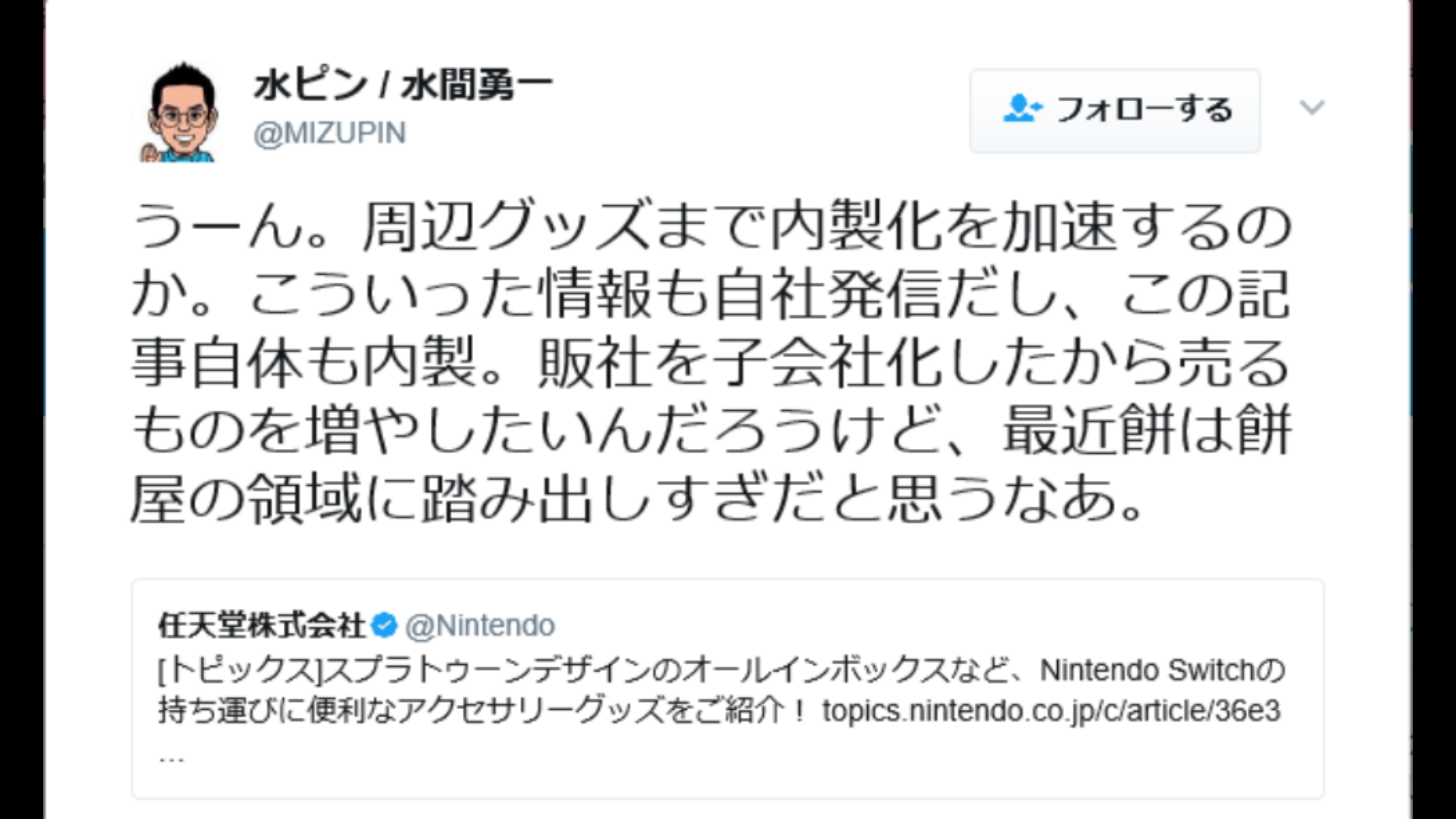うーん。周辺グッズまで内製化を加速するのか。こういった情報も自社発信だし、この記事自体も内製。販社を子会社化したから売るものを増やしたいんだろうけど、最近餅は餅屋の領域に踏み出しすぎだと思うなあ。 https://t.co/igGbjuG0vg— ミズピン / 水間勇一 (@MIZUPIN) May 17, 2017転載元スレッド:https://swallow.5ch.net/test/read.cgi/livejupiter/1613477100/