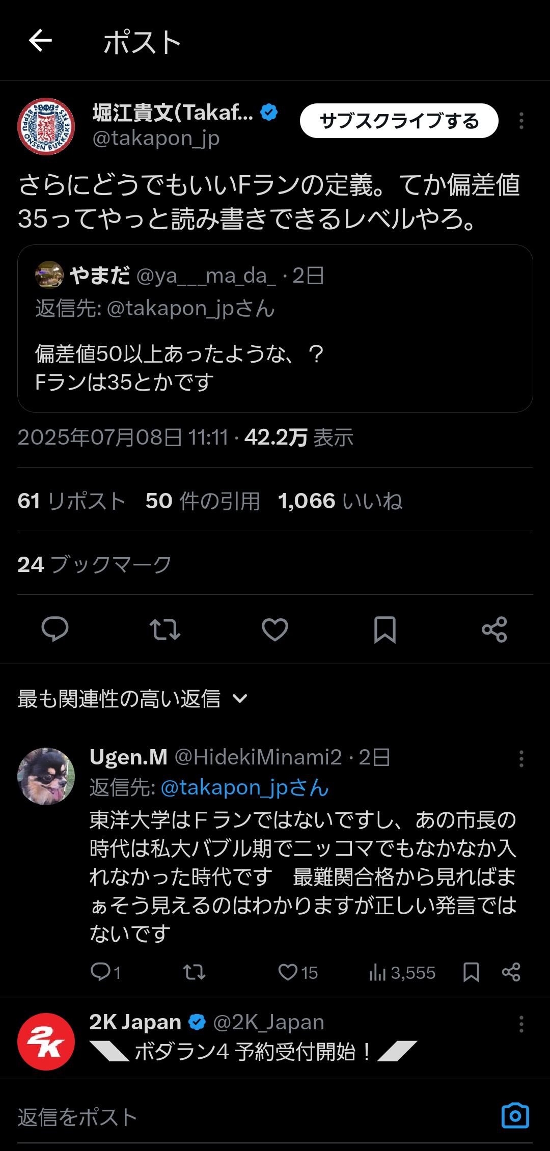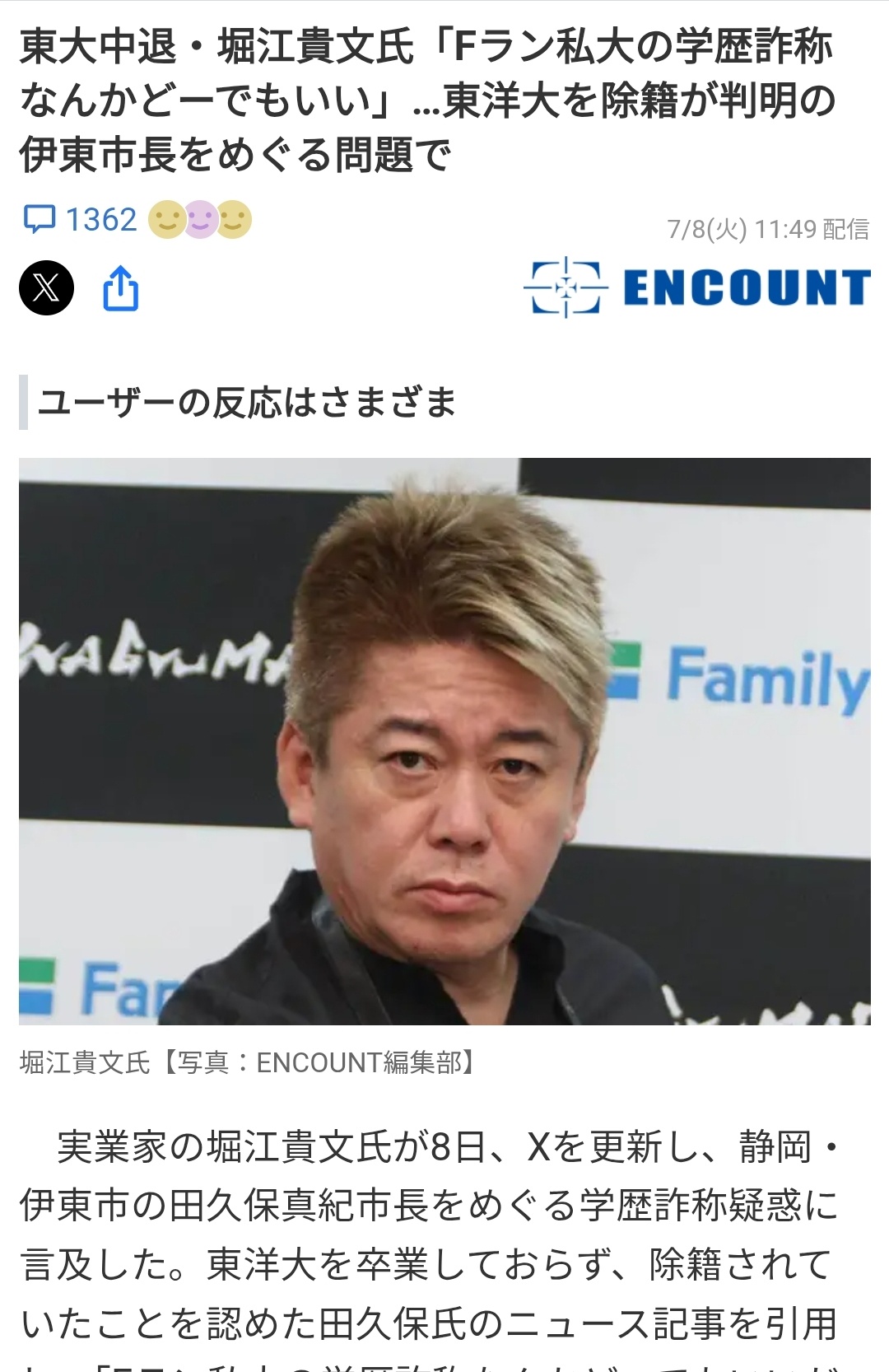 2 : 以下、?ちゃんねるからVIPがお送りします :2025/07/10(木) 19:50:12.400 ID:BCTmOAou0.net堀江「Fランの学歴詐称なんかどうでもいい」X民「東洋までFランにしないで」堀江「え?Fランじゃないの??」→炎上転載元スレッド:https://viper.2ch.sc/test/read.cgi/news4vip/1752144591/