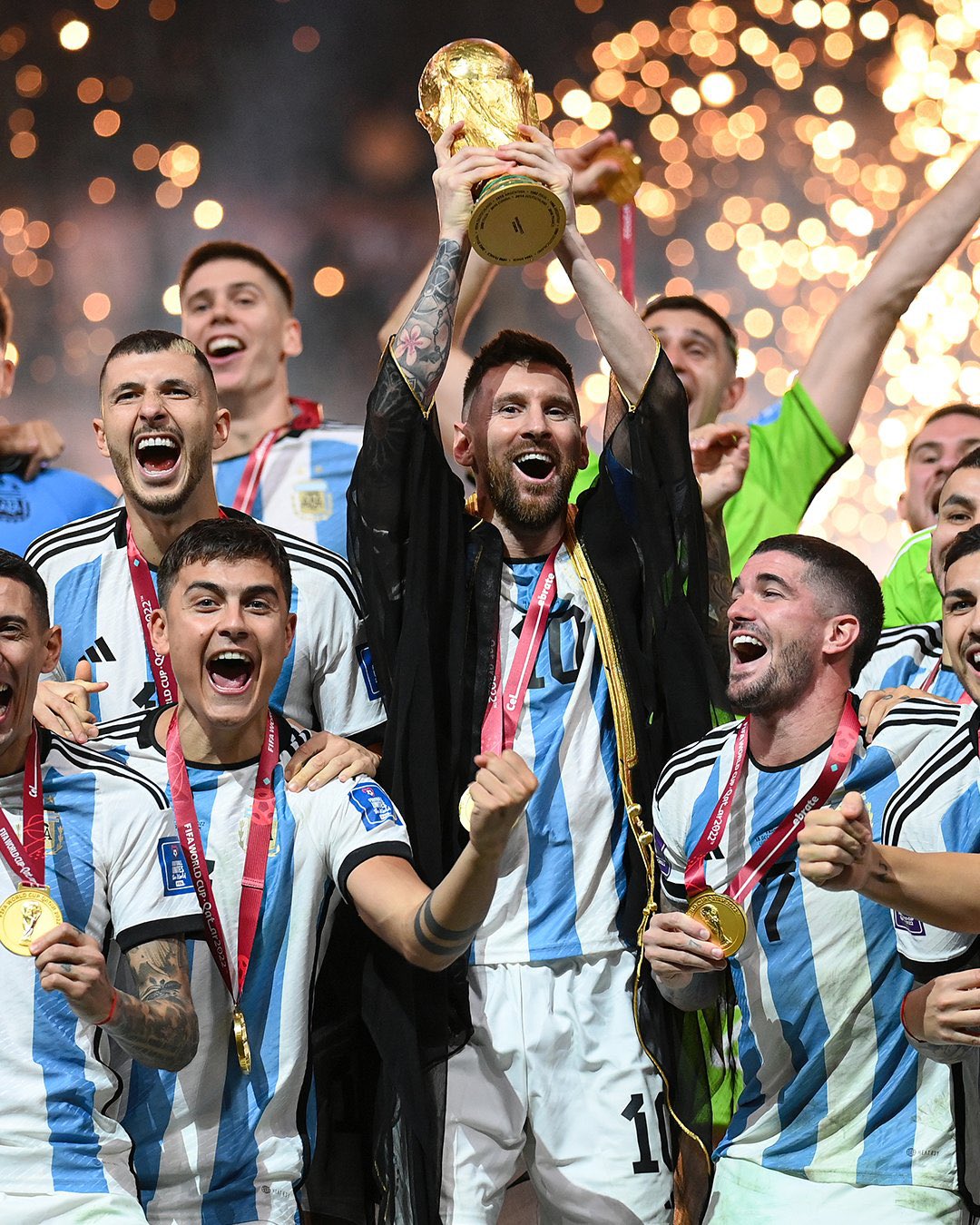 【画像】メッシさん、W杯トロフィーを掲げるのに変なガウンを着せられてしまうwww