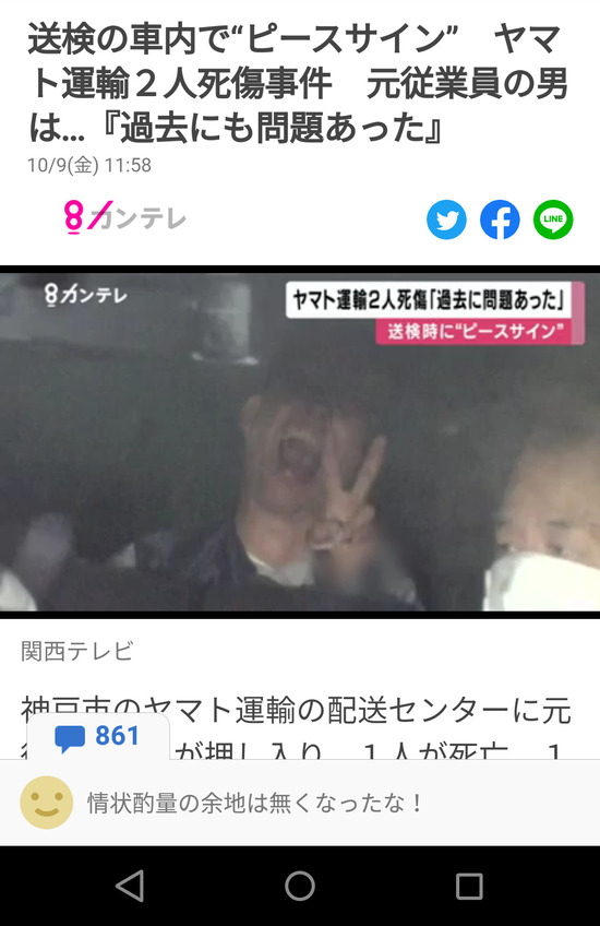 ヤマト男女殺傷事件の犯人、満面に笑みにピースサインで堂々送検www